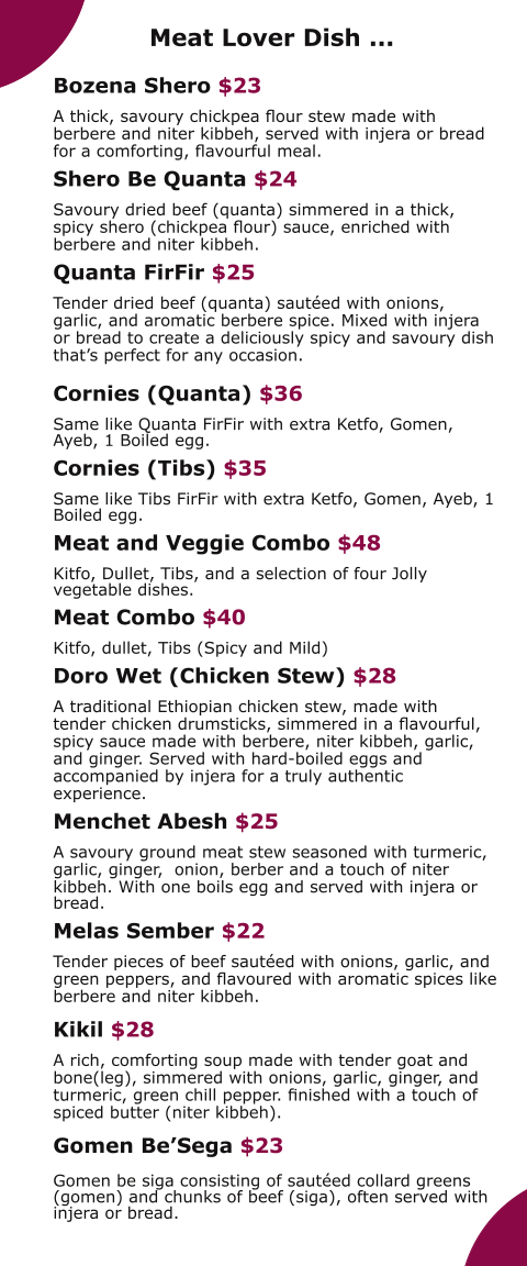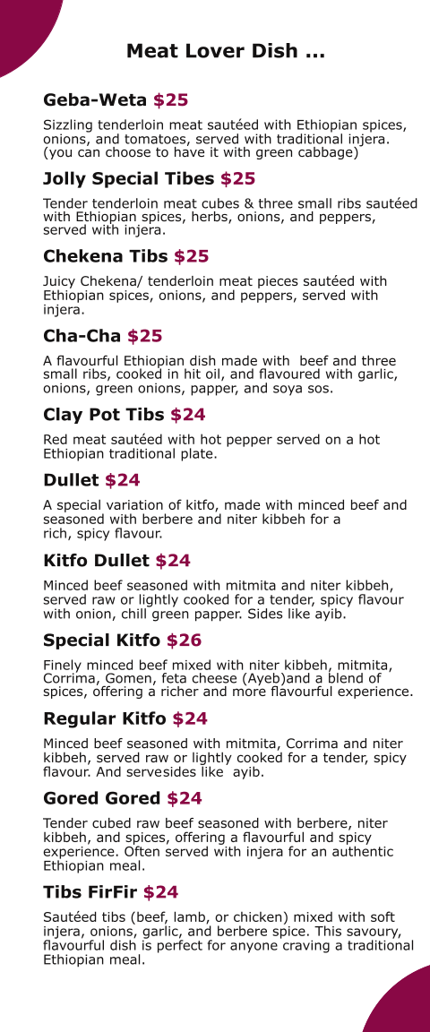 In summary, whether you are searching for a warm breakfast, a hearty lunch, or a relaxed dinner setting, Jolly Ethiopian Bar & Restaurant has everything to satisfy your cravings. With its unique atmosphere, diverse menu, and top-tier service, it’s not just a meal but an experience waiting to unfold. So why wait? Stop by and discover why Jolly has become a beloved spot in Toronto's vibrant culinary scene.