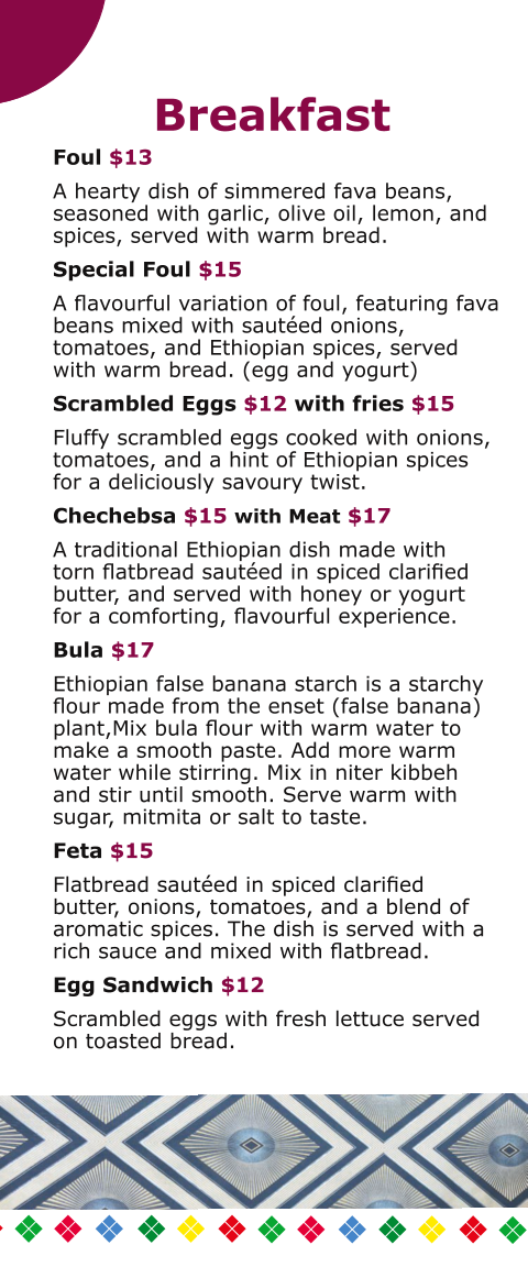 When it comes to the menu, prepare to be dazzled by a tantalizing variety of dishes that showcase the depth and complexity of Ethiopian flavors. Start your day with a hearty breakfast option like the Foul, a luscious medley of simmered fava beans, garlic, and spices served with warm bread—a delightful way to awaken your palate for the day ahead. For those keen on a twist, the Special Foul comes enriched with sautéed onions, tomatoes, and a touch of yogurt for added creaminess.