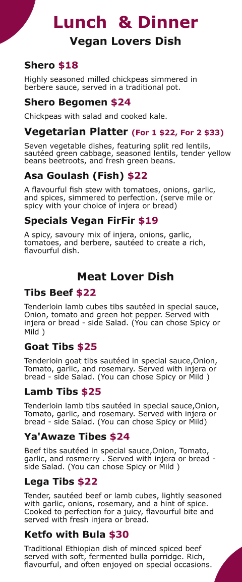 At lunch or dinner, the Tibs dishes are a highlight. Try the Beef Tenderloin Tibs, succulent lamb cubes sautéed to perfection and served with an injera or fresh bread, where every bite is infused with an aromatic special sauce. Alternatively, for something unique, the Goat Tibs adds whispering hints of rosemary to tender goat, elevating your dining experience. With options to enjoy a spicy or mild kick, there's something for every taste preference.